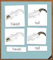3- الاستعانة بالكروت الثلاثية وهي عبارة عن ثلاث بطاقات, البطاقة الأولى يوجد بداخلها صورة للتمساح مع اسم المرحلة التي يمر بها, وبطاقة أخرى تضم الصورة دون أي كلام والبطاقات الثالثة هي عبارة عن كلام فقط وبالتالي يقوم الطفل مطابقة جميع الكروت مع بعضها.